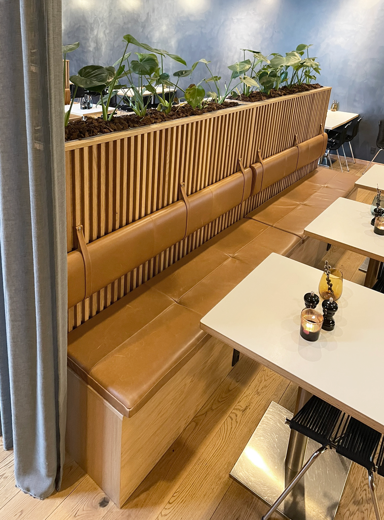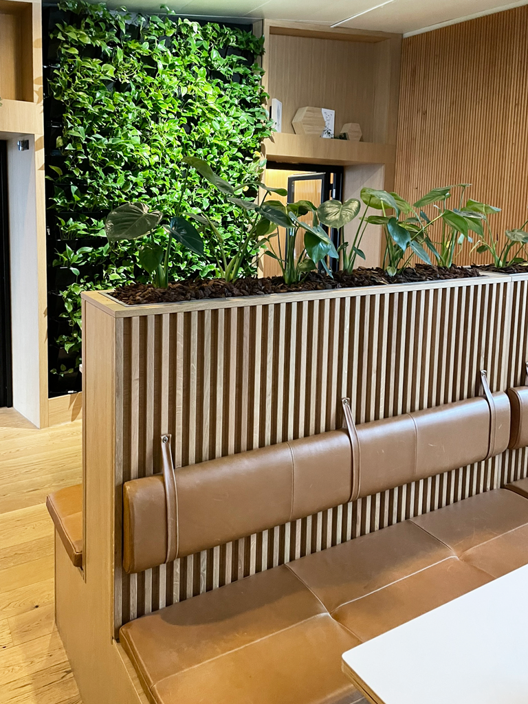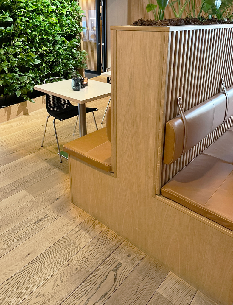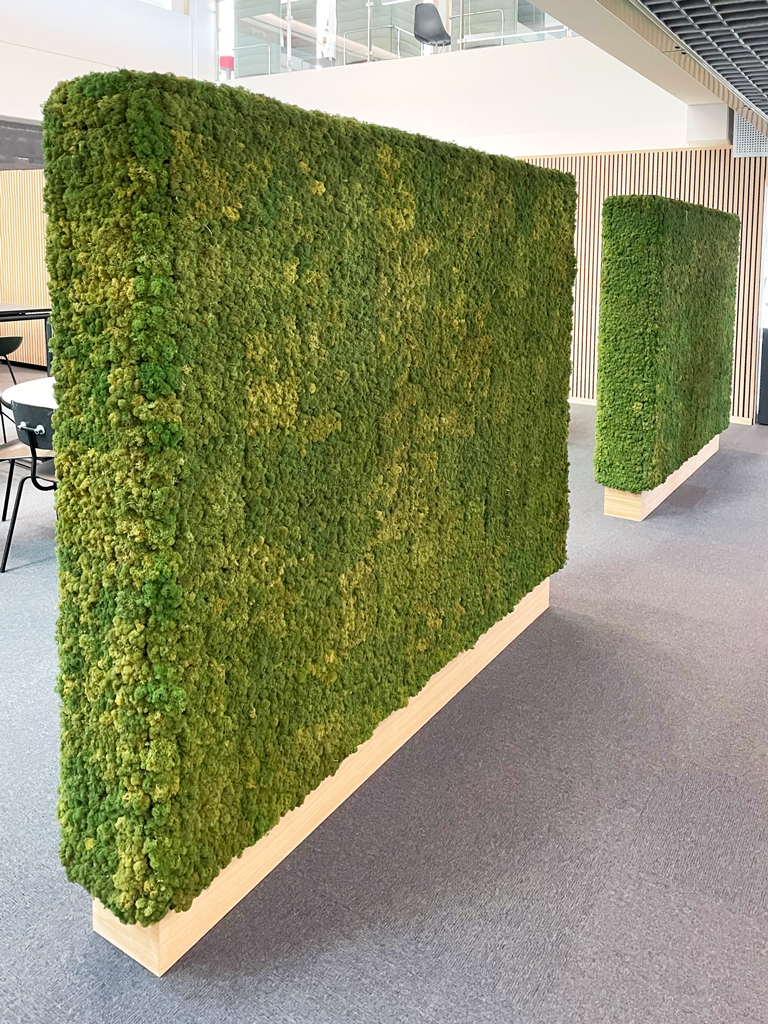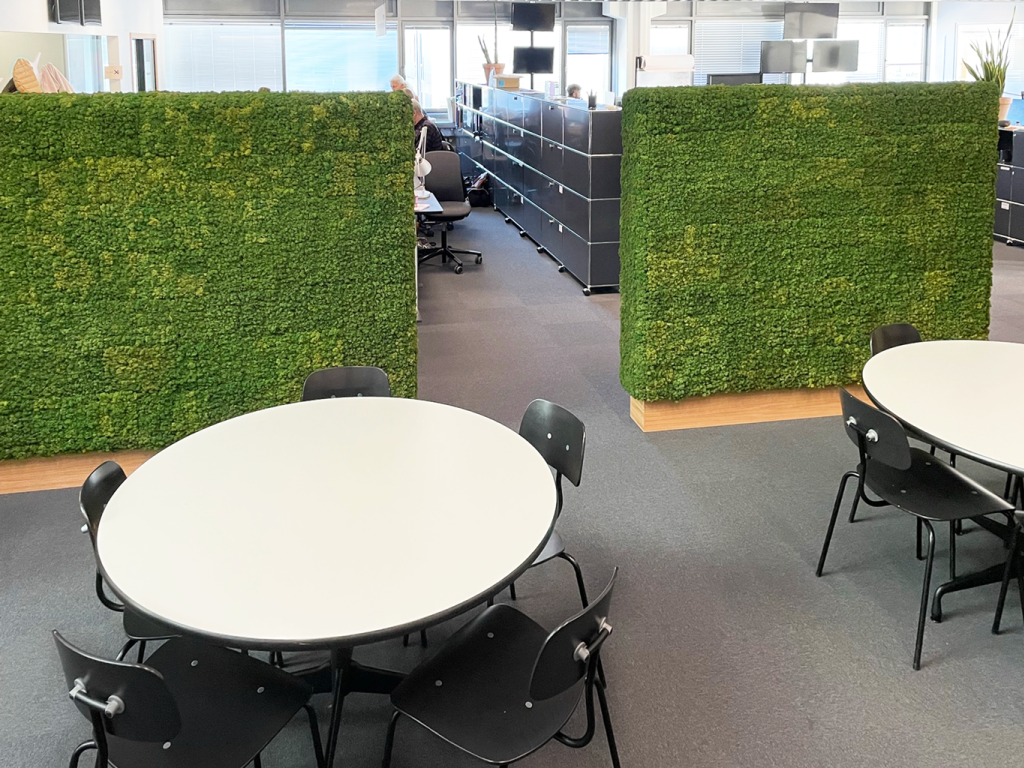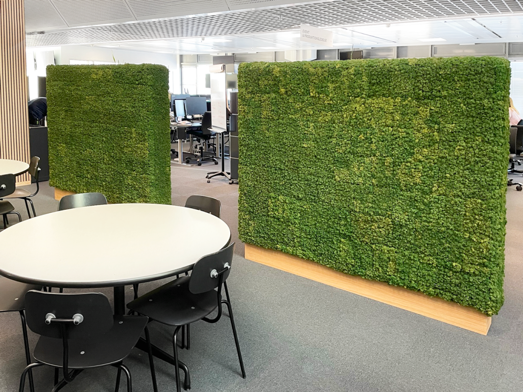 - identitetsvæg med heldækket mos - lydoptimering i åbent kontor: skærmvægge med grøn mos - spiseborde og stole til kantinen - specialdesign sofaer som lamelbænke