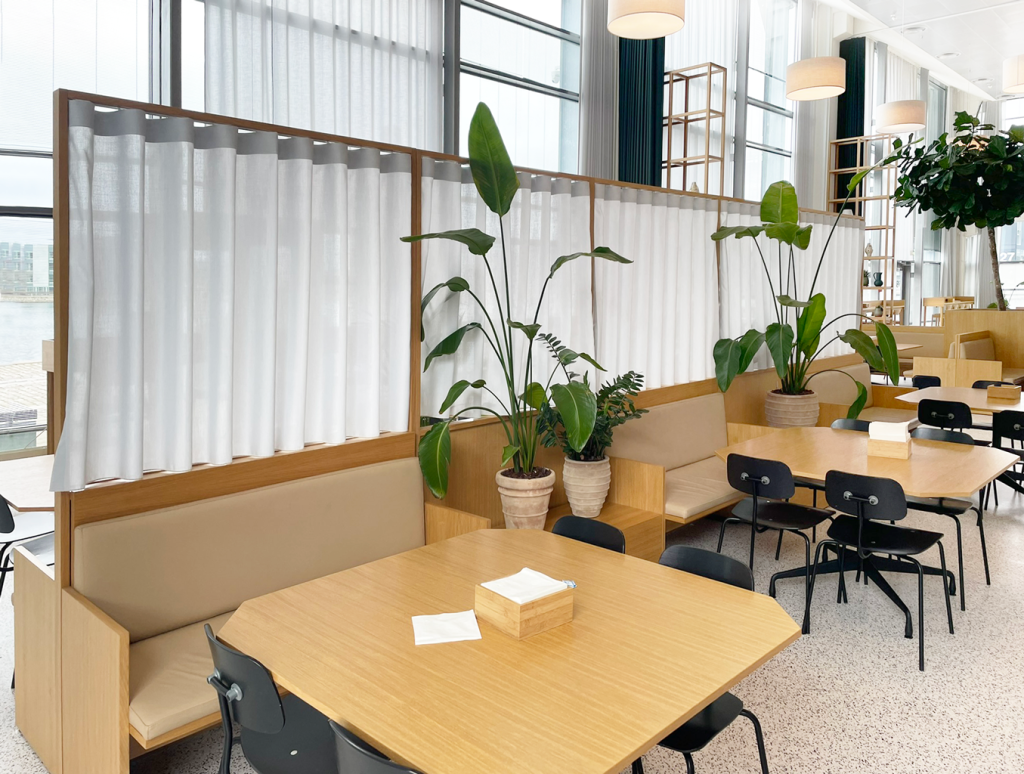 God akustik kommer i mange eksemplarer. TV2 har integreret mos-skærmvægge med gode, akustiske fordele! Kantinen har fået lamelpaneler på specialdesignede siddepladser, så akustikoptimeringen blev ligeså vigtig for øret som for øjet. Øverst med en planteverden, der skiftes efter årstiden.