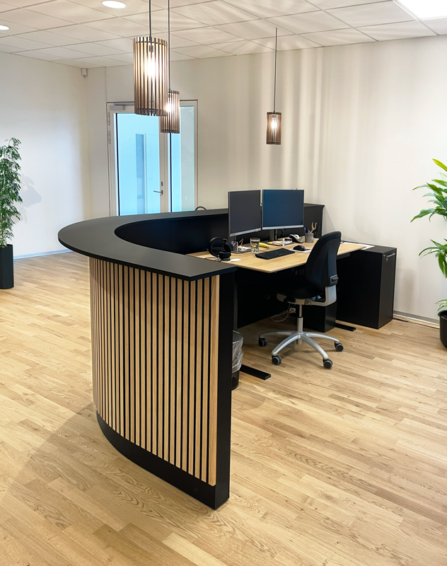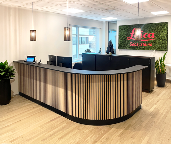 Vi hjalp Leica Geoystems med en indbydende reception. Målet var en moderne og tiltalende skranke, der kunne skabe det gode førstehåndsindtryk og være effektiv for receptionisten i hverdagen. En moderne lamelskranke med bue for at skabe et lukket område for forbipasserende.