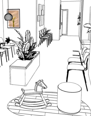 Er der et hjørne til børn og forældre? Inddeling af siddepladser og zoner kan visualiseres via møbler, farver på væggene og fx planter.