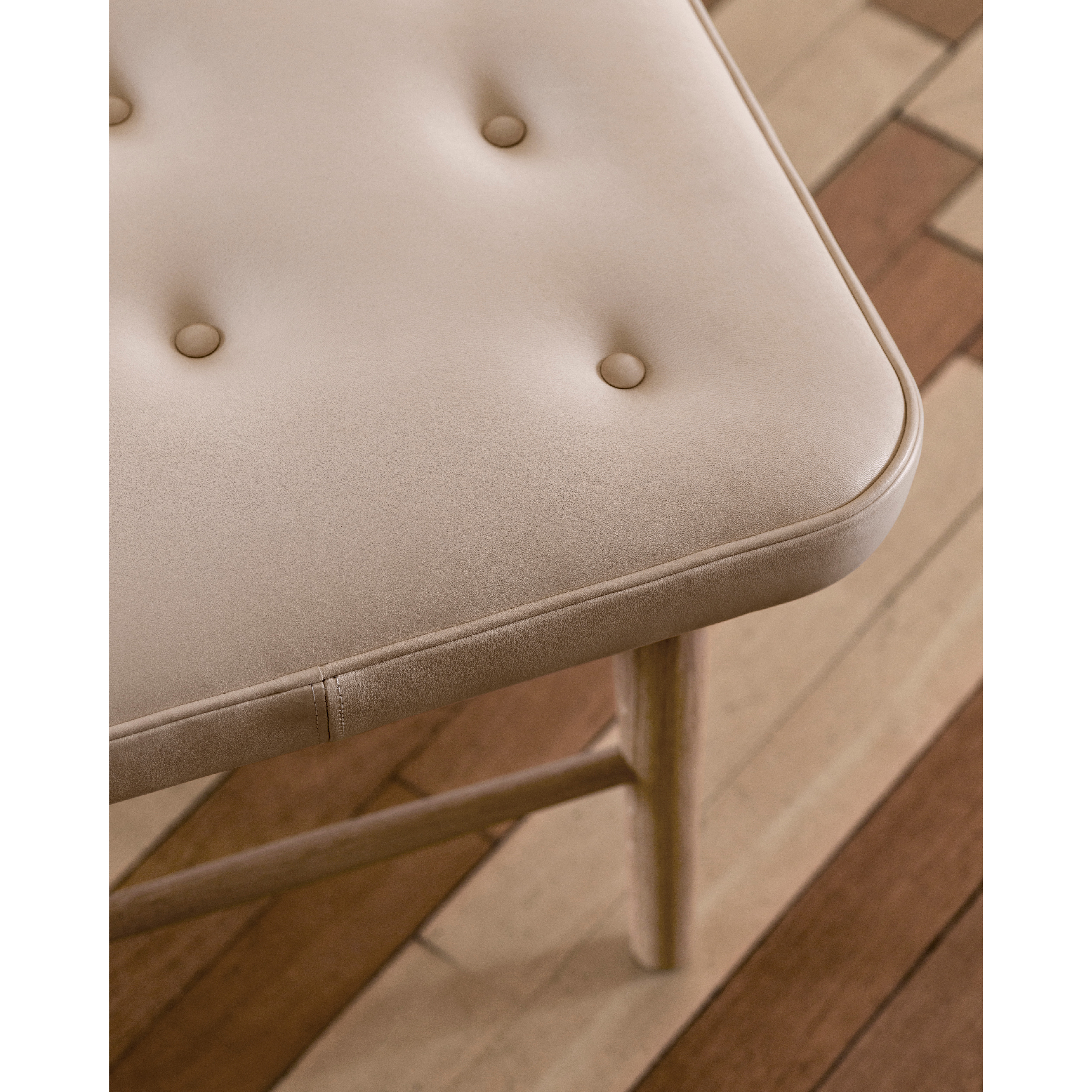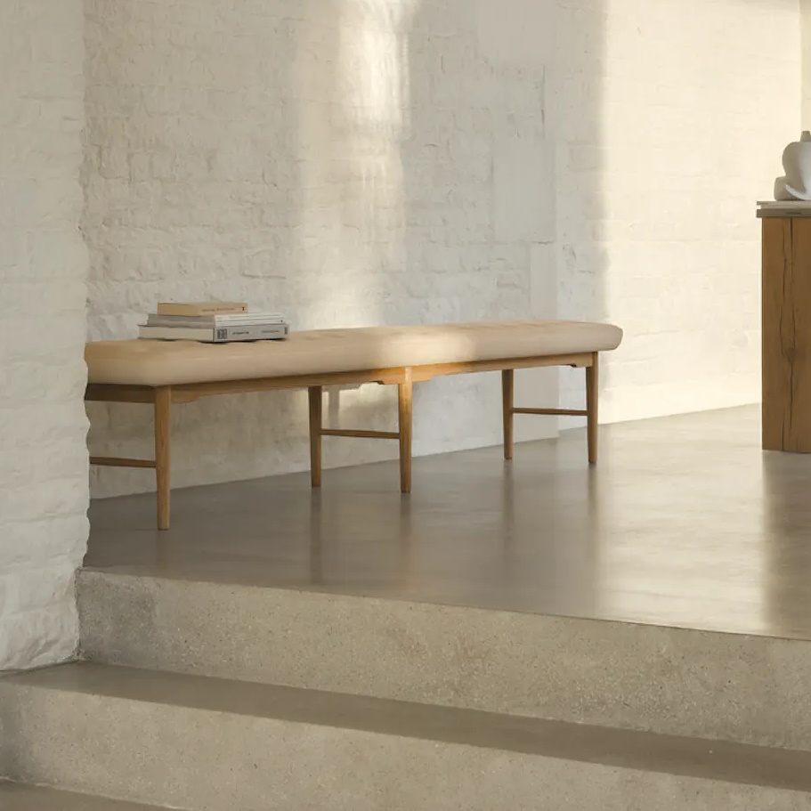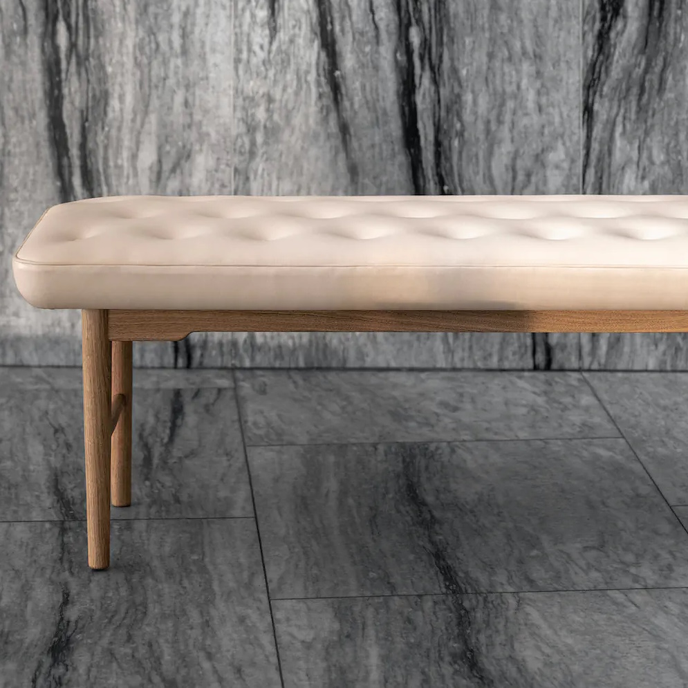 VLA75 Foyer-bænk er en delikat og stilren bænk, der med sit design giver en behagelig og svævende atmosfære til rummet. Foyer-serien blev skabt af Vilhelm Lauritzen i 1945 eksklusivt til Radiohuset i København. Sammenspillet mellem det massive egetræ og de polstrede sæder er et kendetegn for Foyer-serien. De omhyggeligt polstrede sæder, der er betrukket med elegant læder og de håndlavede knapper gør, at sæderne fremstår nærmest svævende på det massive egestel. Bænken er tilpasset i længde og komfort til nutidens krav og behov uden at gå på kompromis med det originale design.