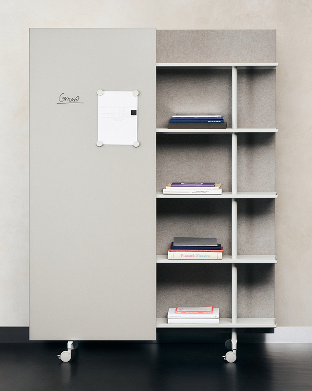 Reolen kan udstyres med forskydelige MOOD- eller matte SILK-GLASS®-moduler med lydabsorberende stofbagside. Det er også muligt at vælge hele stofmoduler, som samtidig fungerer som opslagstavler. Modulerne kan monteres og afmonteres uden brug af værktøj, hvilket gør det let at tilpasse løsningen efter behov.