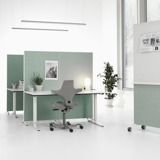Alumi Kombiskærm, designet af Nina Jobs, er en enkel og praktisk skærmvæg, der fungerer som skrivetavle og lydabsorbent. Den ene side er en kombination af skrivetavle foroven og en lydabsorberende filtplade forneden, mens den anden side er én stor filtplade, som er med til at forbedre akustikken.