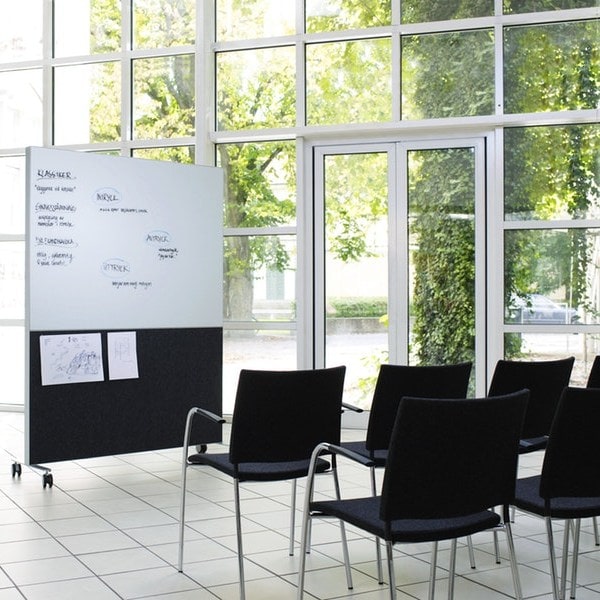 Alumi Kombiskærm findes i en Double version, hvor begge sider er kombineret skrivetavle og filtplade. Den emaljerede skriveoverflade kan tilkøbes i glas.