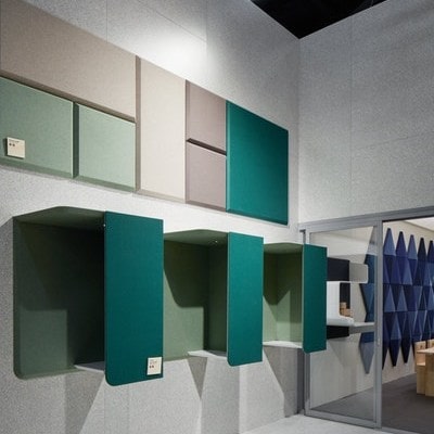 Domo serien består ud over vægpanel af bordskærm, bordskærmbås, Bås rum i rum, gulvskærm og vægboks.