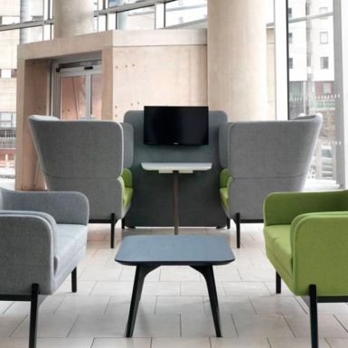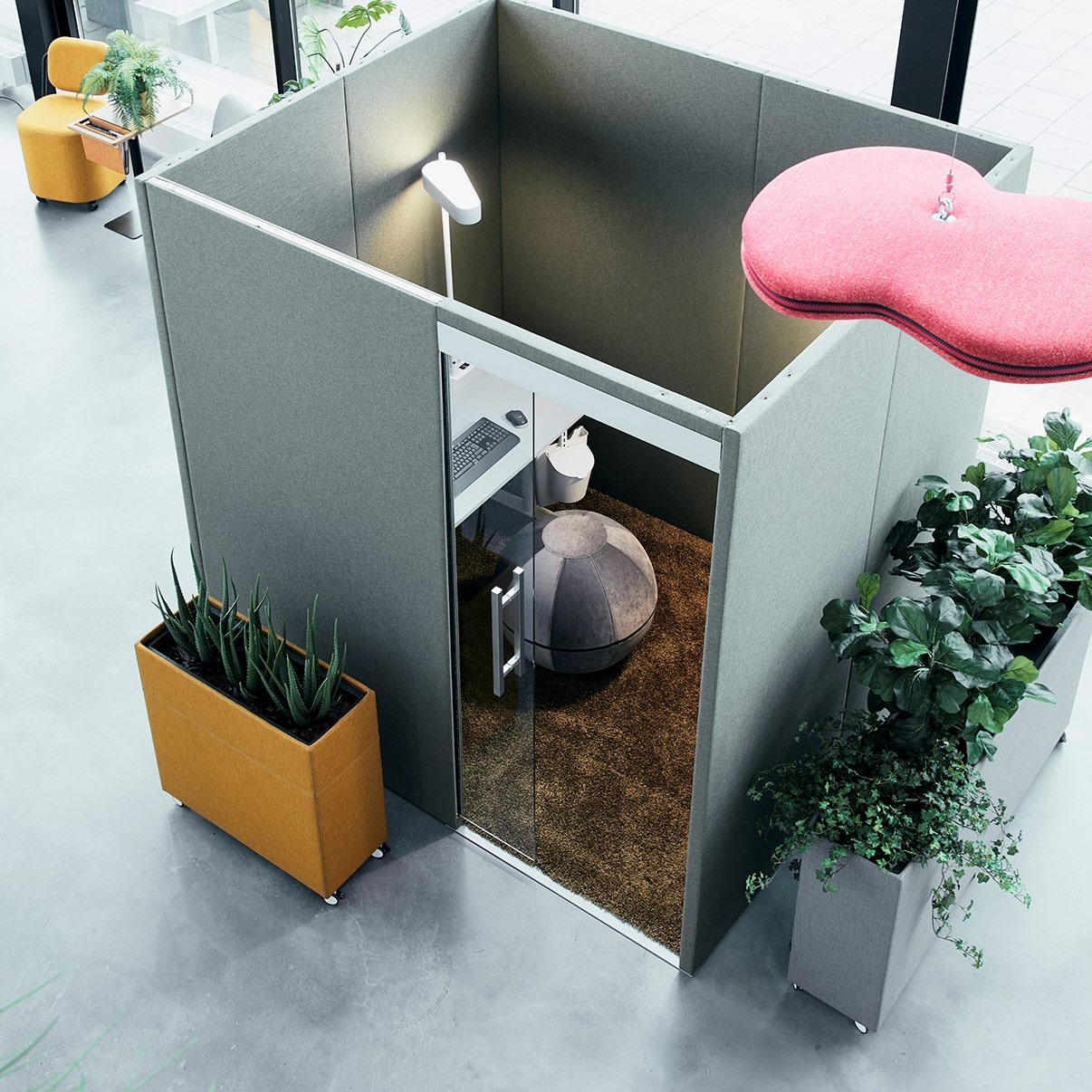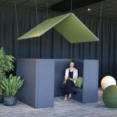 The Cabin giver afskærmede og lyddæmpede effekt i storrumskontoret. Væggene er bygget af flere paneler, fremstillet af en træramme med 50 mm indvendig lyddæmpning, beklædt med skumlamineret tekstil. The Cabin har intet tag, men med de høje vægge, kan kombineres med flere typer nedhængte lydabsorbenter. Telefonboksen kan leveres i to størrelser, og indgangen består af en glasdør. Der er rige muligheder for valg af stofkvalitet og farver.