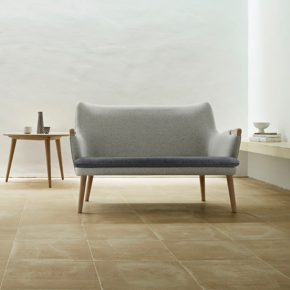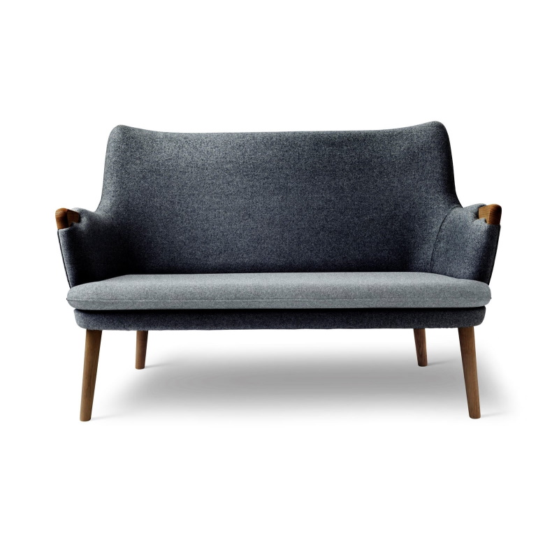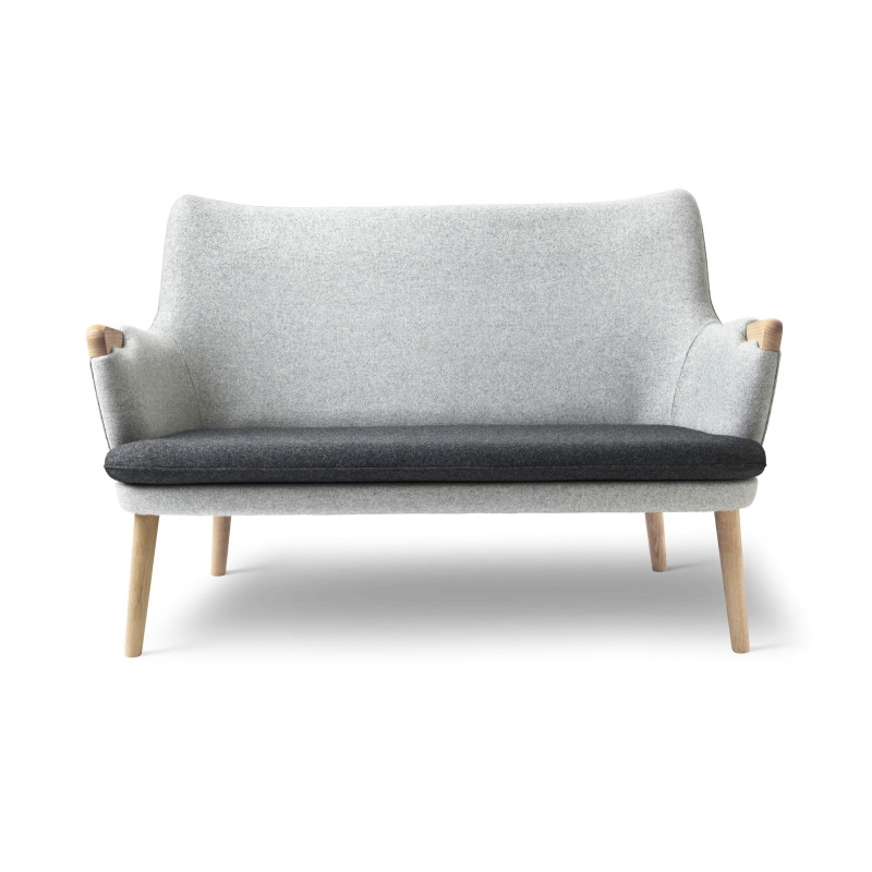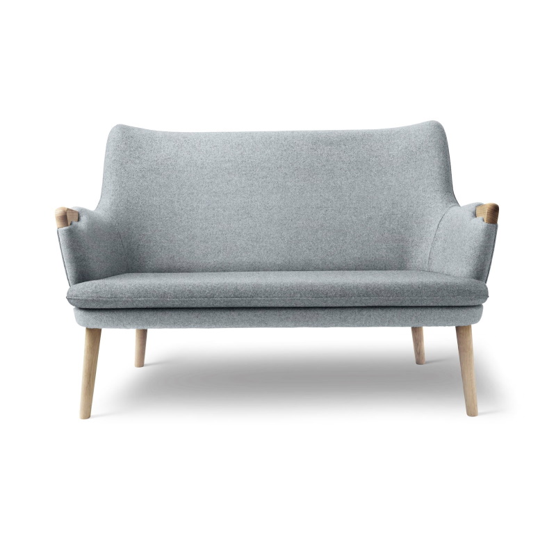 CH72 2-personers sofa passer perfekt til små rum, de små dimensioner og kompakte design er velegnet til et chefkontor, venteværelse, mødelokale og til private rum med sparsom plads. Sofaen er smuk uanset fra hvilken vinkel man betragter den. Sædet er løst og giver god mulighed for rengøring. Den tekniske finesser ved polstring kræver dygtig et dygtigt håndværk specielt hvor armlænspolstring møder de elegante armlæn i træ. De tilspidsede ben i massivt træ giver en lethed i udtrykket.