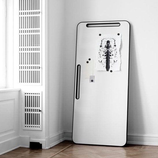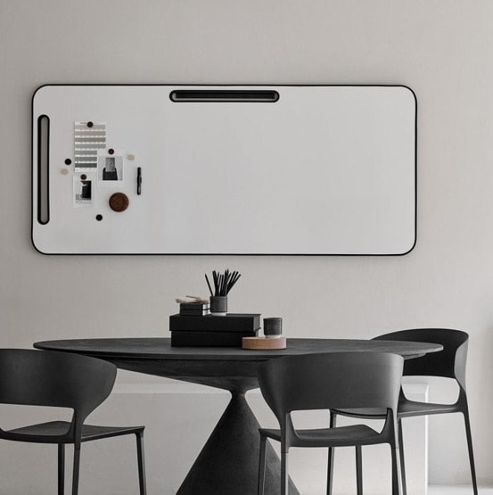 Note Whiteboard er en moderne dobbeltsidet whiteboard med magnetisk, stålkeramisk skriveoverflade og en ramme af sort gummi. Tavlen har håndtag, som også fungerer som ophæng på det medfølgende vægbeslag. Note whiteboard er fremstillet i et letvægtsmateriale, der gør den let at vende eller tage med sig.