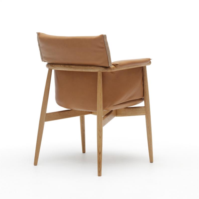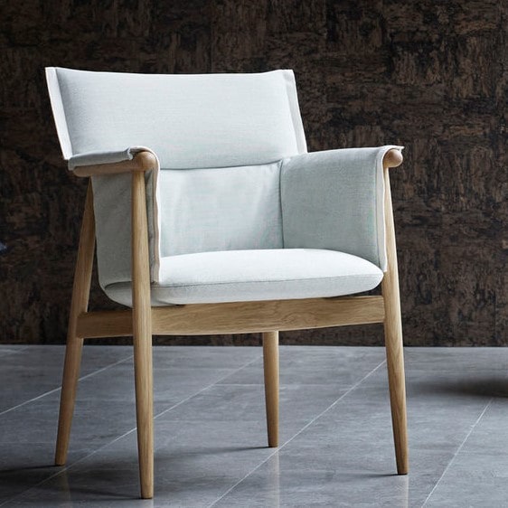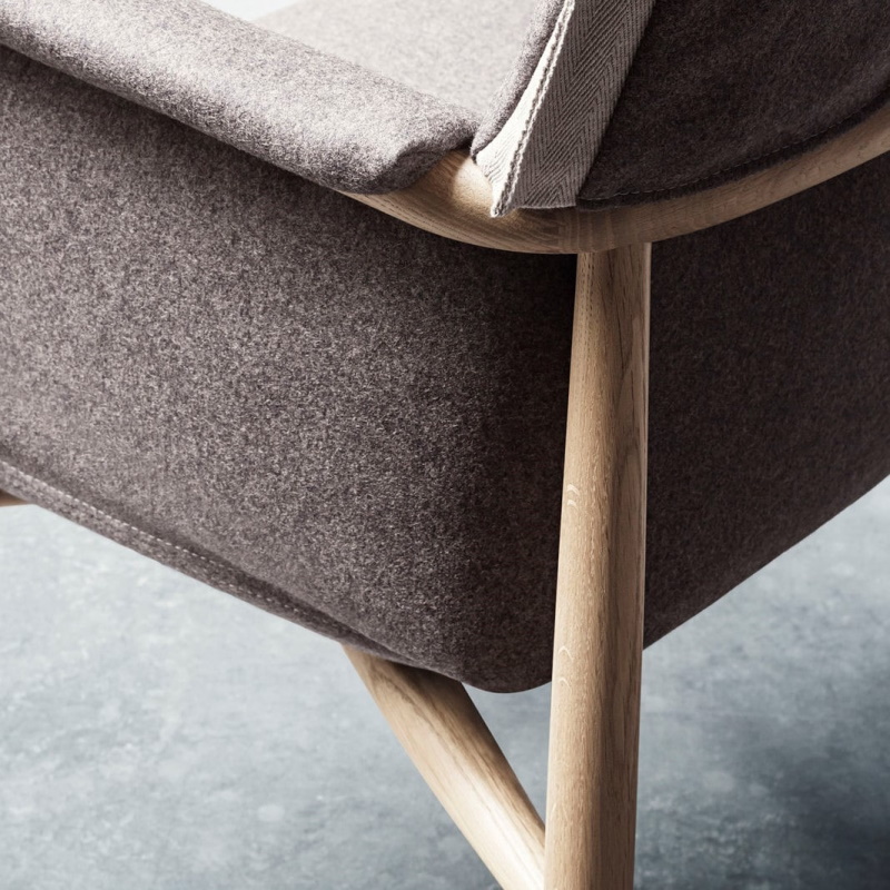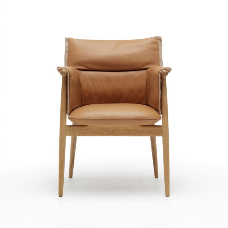 Embrace stolen med armlæn forener den enkle træstruktur med blødt polsterarbejde, og skaber dermed en elegant stol, der er så udtryksfuld, at den samtidig kan stå alene i ethvert rum som en brugbar skulptur. Stolens stel er udformet i træ, der er synligt fra alle vinkler. Især rygstykket understreger i al enkelhed det elegante håndværk. Embrace fås også uden armlæn, som loungestol med skammel til.