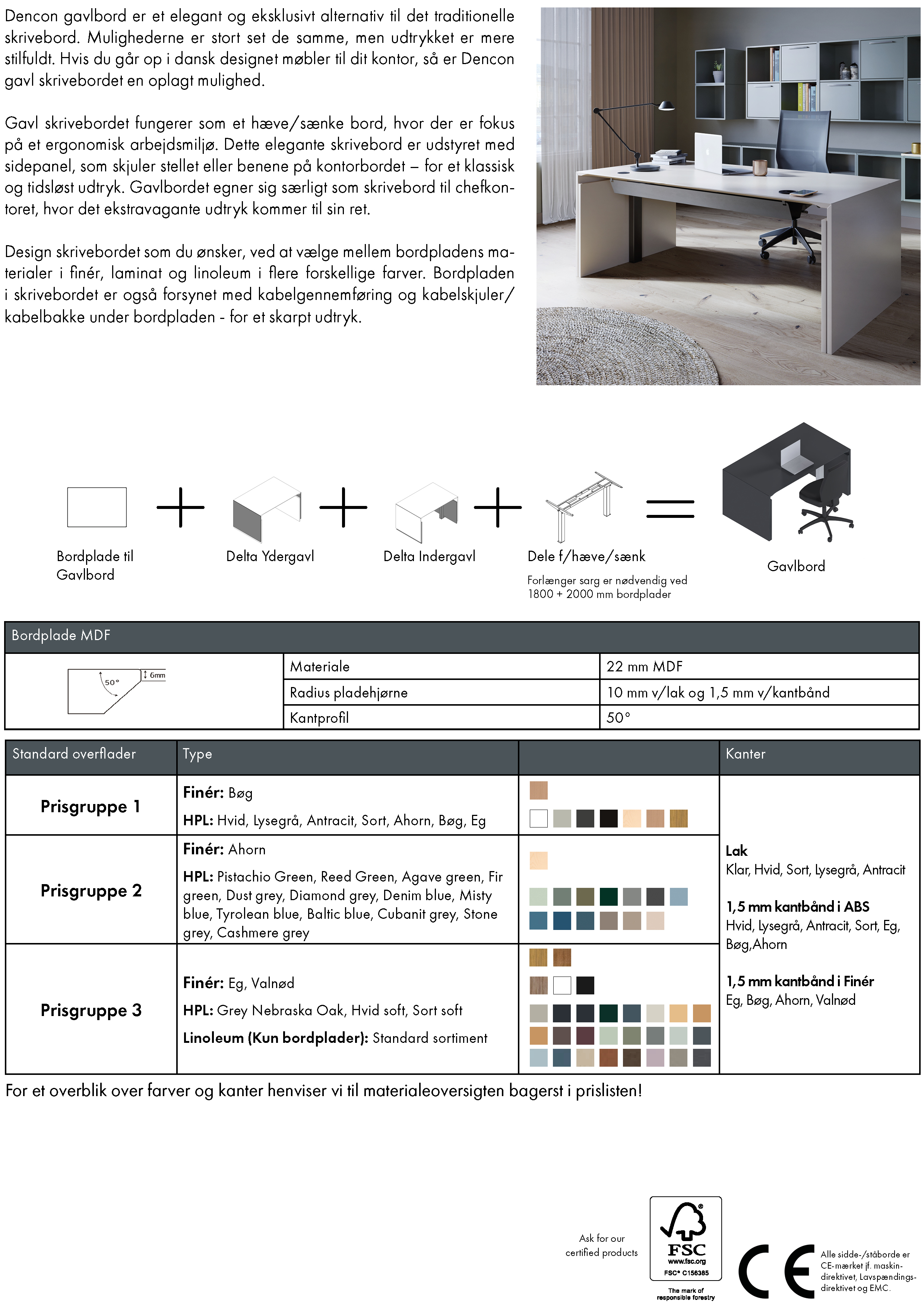 Gavlbordet fra Dencon er et elegant og eksklusivt alternativ til det traditionelle arbejdsbord. Udtrykket er mere stilfuldt men ellers er mulighederne stort set de samme. Bordet fås med plader i forskellige størrelser og former samt med stel og med - eller uden hæve/sænkefunktion. Desuden tilbydes der en række tilkøb som for eksempel kabelbakker, forskellige typer kabelgennemføring, og et flot frontpanel. Gavlbordet tilbydes desuden i flere forskellige farver.