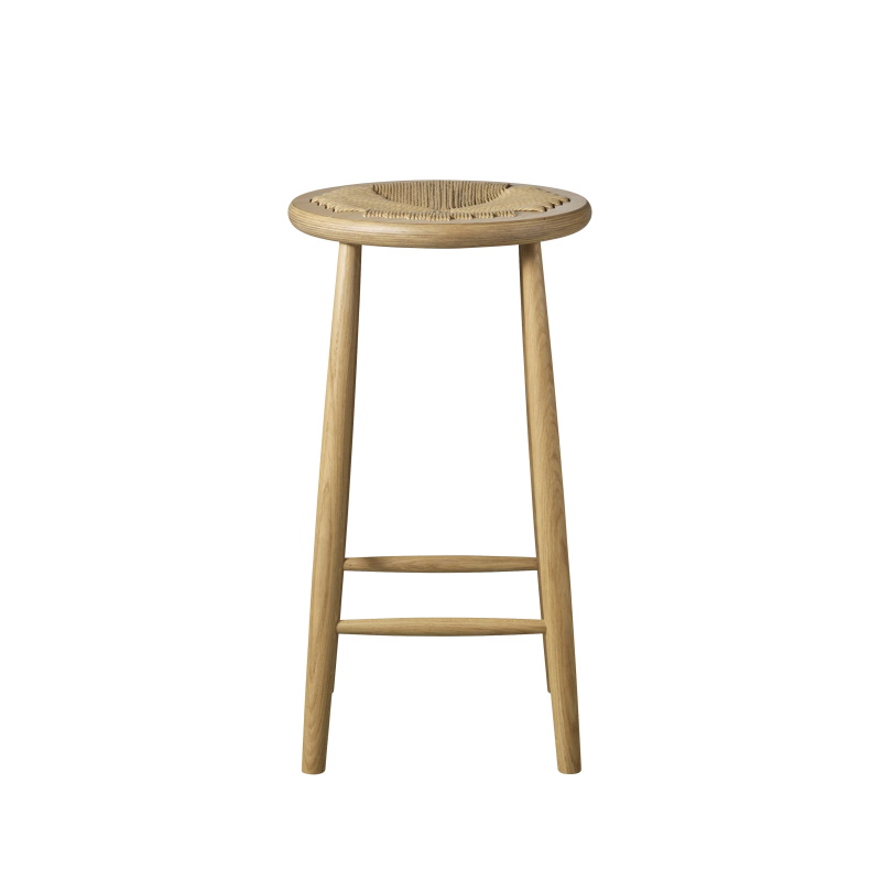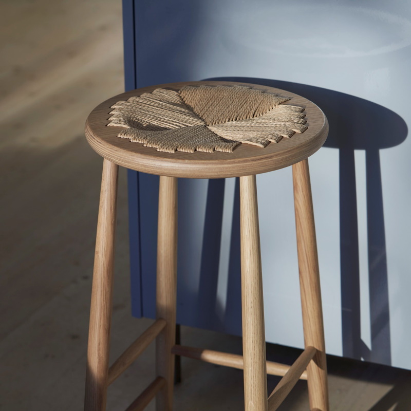 Den runde counter er punktummet på en hel serie af klassiske siddemøbler i massiv ege- og bøgetræ med sæde af papirflet, som arkitekten Jørgen Bækmark designede til FDB møbler.