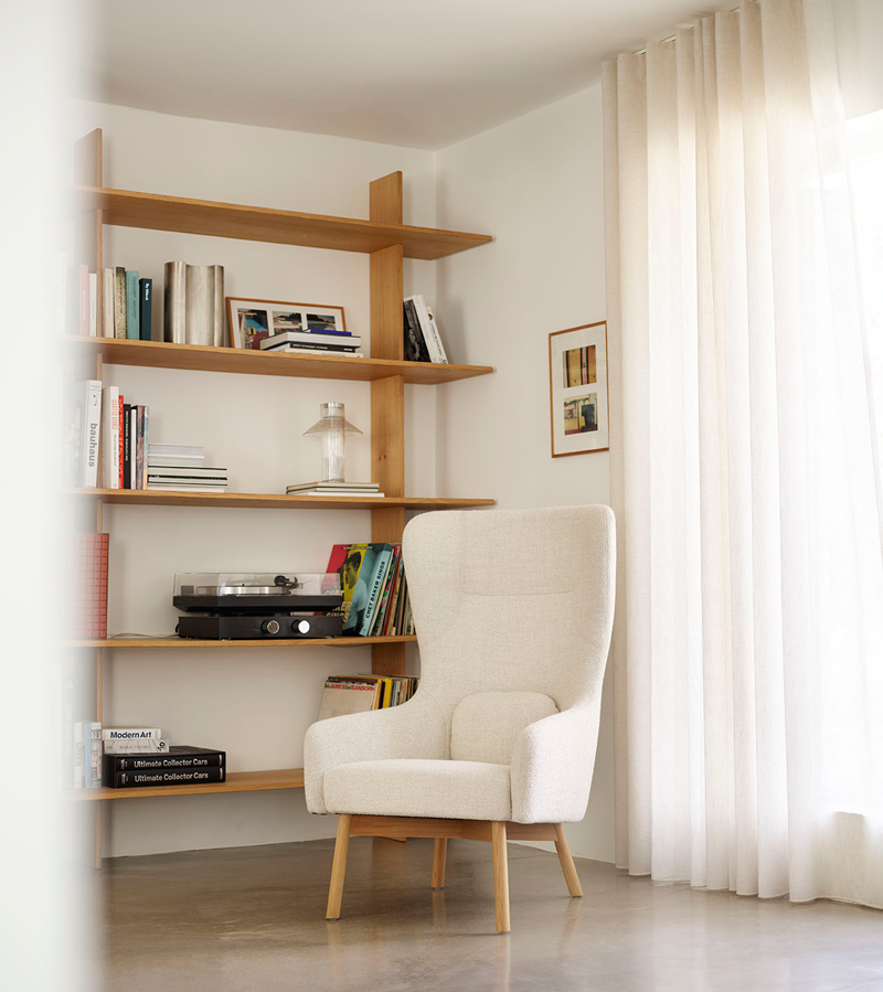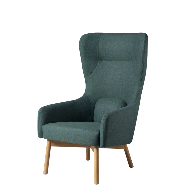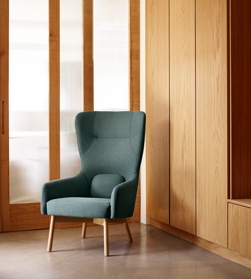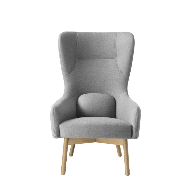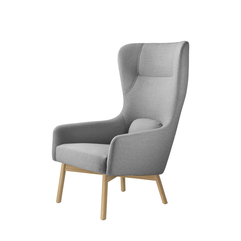 L35 Gesja øreklapstol er en moderne fortolkning af den klassiske øreklapstol. Den er fuldpolstret med betræk i polyester eller uld i flere farver og har stel af eg. Gesja-serien indeholder også loungeborde og sofaer.