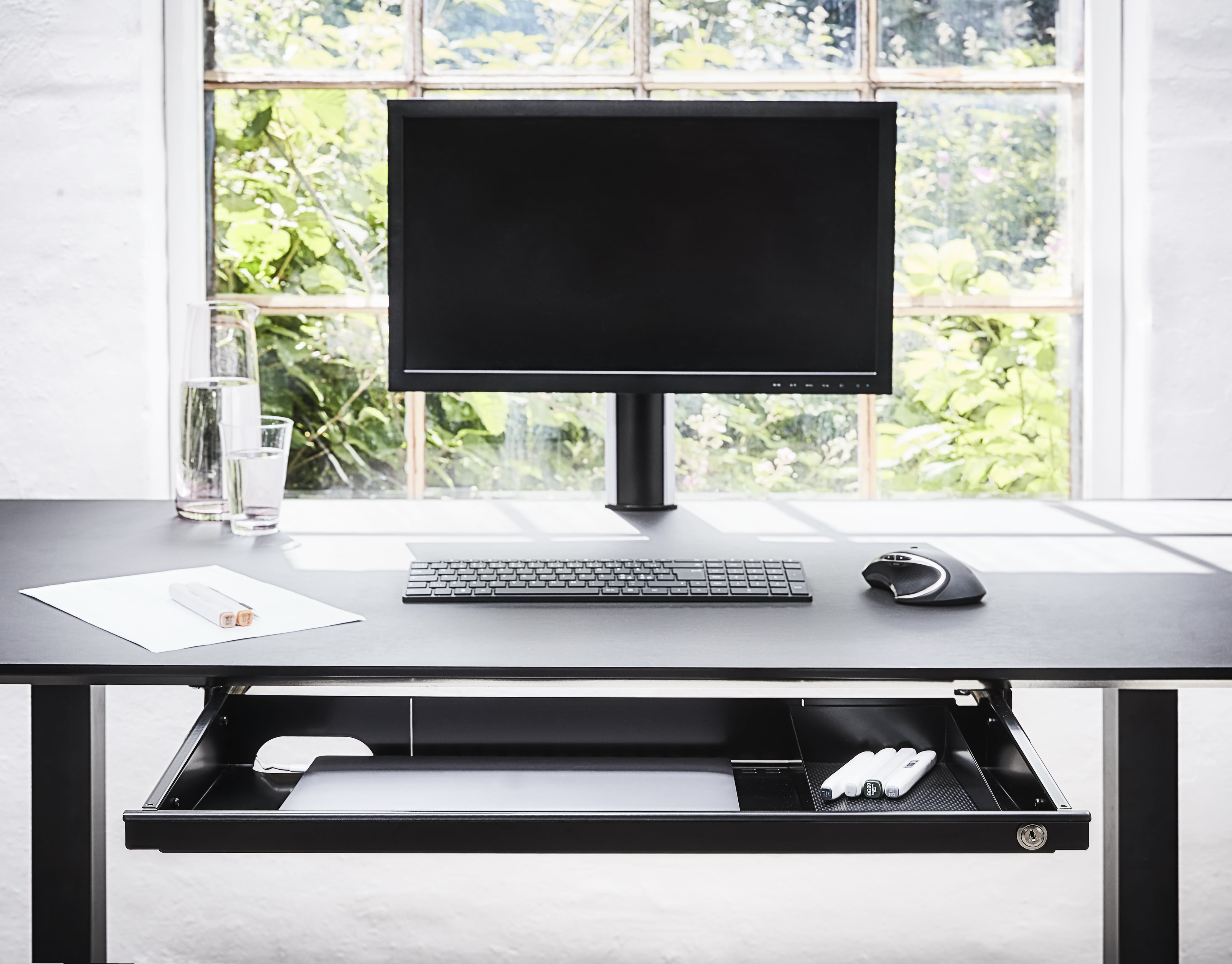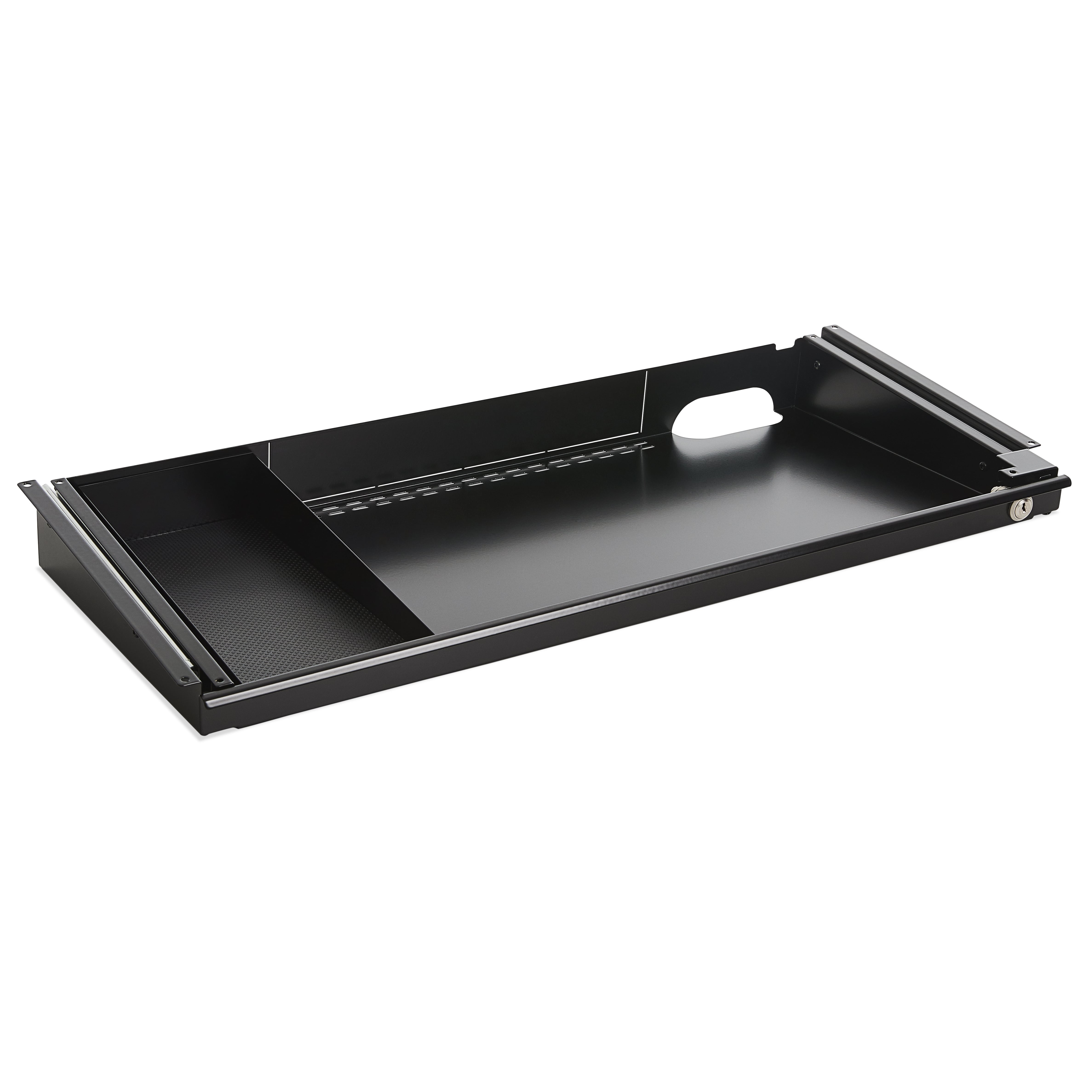 Laptopskuffe Athene er en moderne og alsidig laptopskuffe der grundet sit design og en dybde på kun 316 mm egner sig til langt de fleste skriveborde. Skuffen har 2 udluftningshuller på bagsiden så ens laptop ikke bliver overophedet. Ønskes der mere udluftning, kan størstedelen af bagsiden tages af. Laptopskuffe Athene fås i 3 forskellige farver, sort, alu og hvid, og kommer som standard med lås og indsats til skuffen i sort fås som tilkøb. Desuden kan der tilkøbes en bambusliste der fås i forskellige farver, så skuffen får et mere æstetisk look der passer til lige præcis din arbejdsstation.