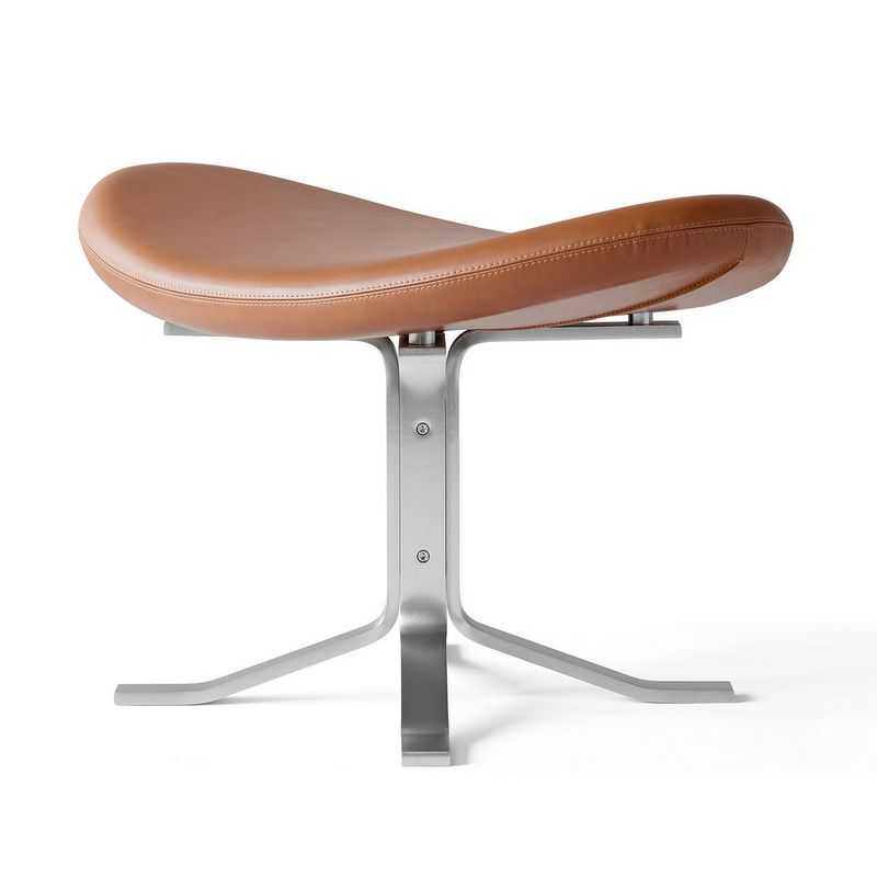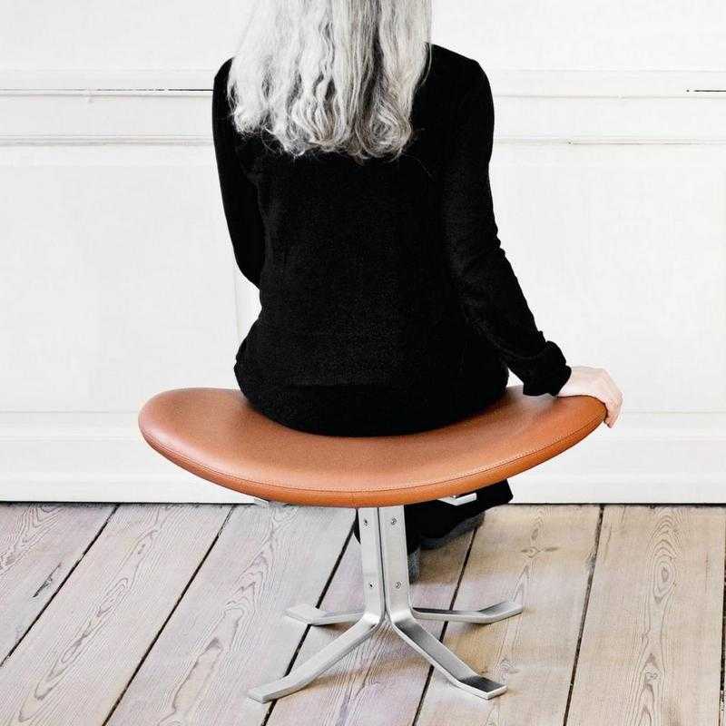 Poul M. Volthers skulpturelle fodskammel tegnet til den ikoniske loungestol Corona Stol, der med sine elipseformede, polstrede sædepuder er blevet en elsket designklassiker.