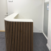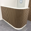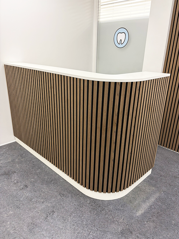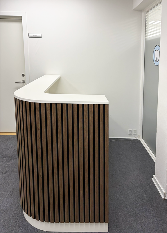 MONI LS4 er en specialdesignet skranke med et blødt buet formsprog og mørke lameller, der giver et roligt og eksklusivt udtryk i jeres lokaler. Skranken er udviklet til klinikker, men fungerer lige så godt i receptioner og andre professionelle miljøer, hvor førstehåndsindtrykket er vigtigt.
