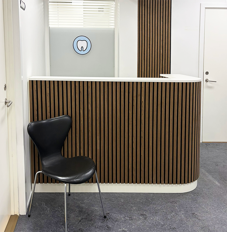 Den buede front skaber en imødekommende velkomst og bidrager til et mere flydende layout i indretningen. De mørke lameller tilfører dybde og struktur, som gør skranken til et naturligt samlingspunkt i lokalet.