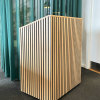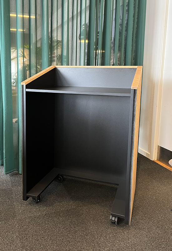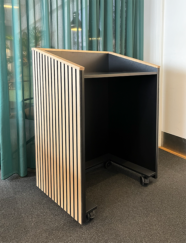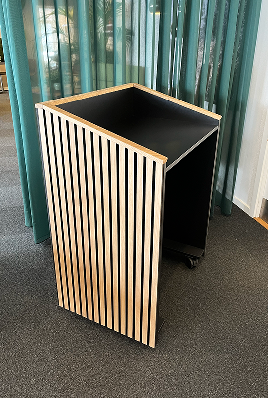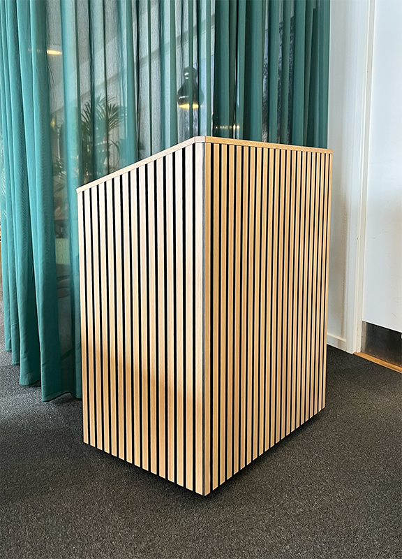 MONI talerpult med lameller skaber hurtigt scenen for jeres konference, møde, foredrag eller præsentation. Nem at flytte rundt pga. hjul og fylder ikke meget i et lokale, der også bruges til andre formål.