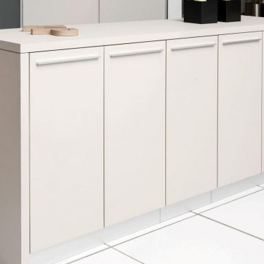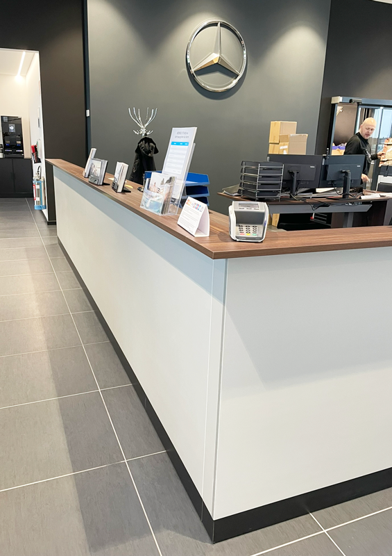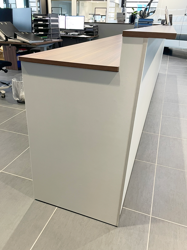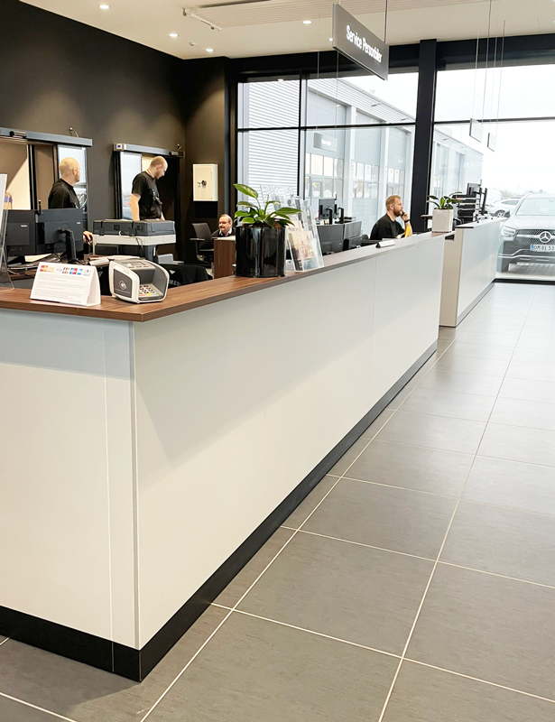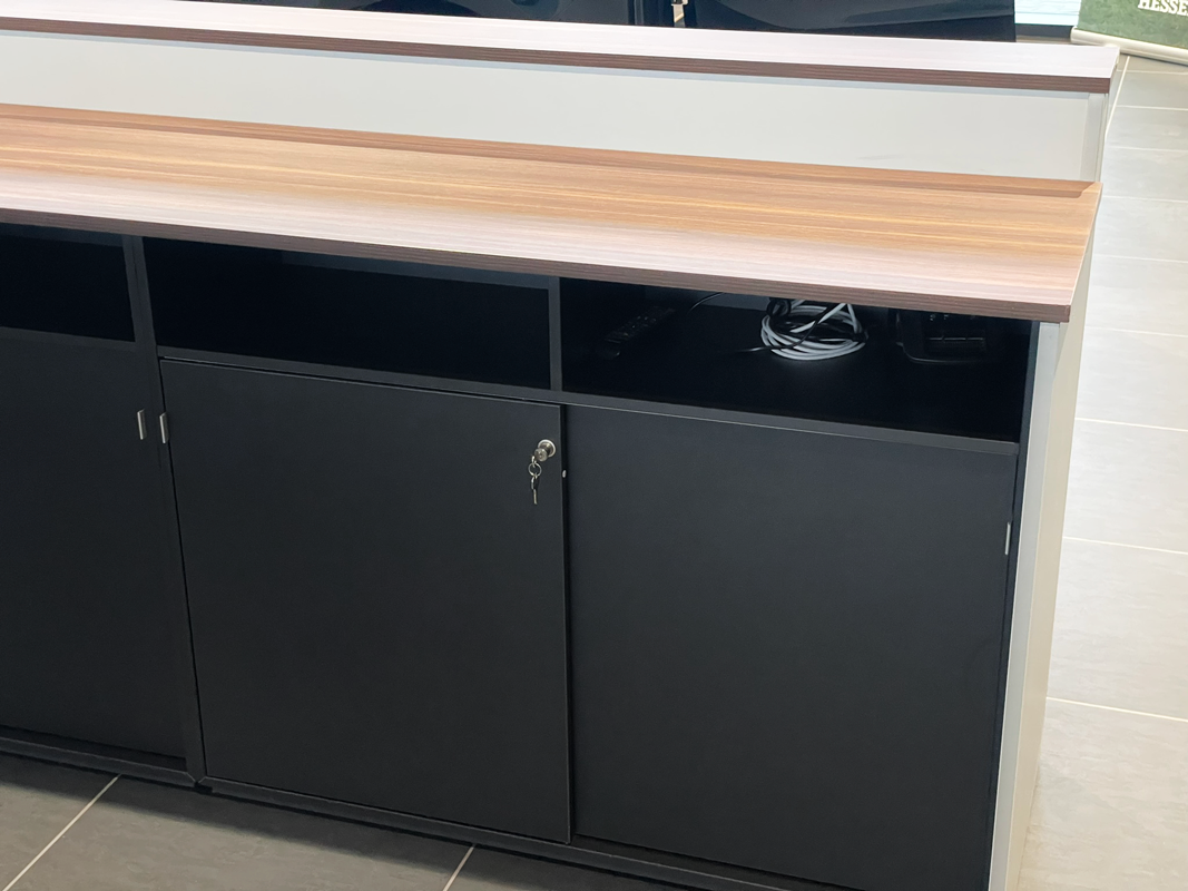 Skranke med 2 bordhøjder i fin hvid farve, sort bund og egetræsbordplade. Stor arbejdsplads for medarbejderne bag, men dette skjules fint bag et minimalistisk ydre med denne skranke.