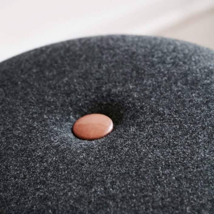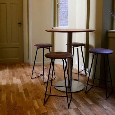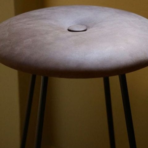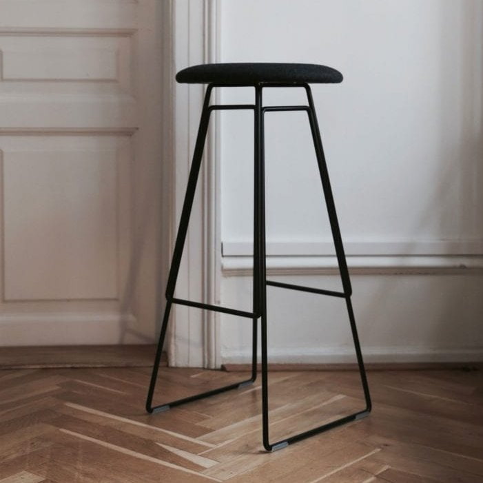 Time Barstol fås med sortmalet stel eller med blankt krom. Sædet er polstret med knap i stof eller læder.