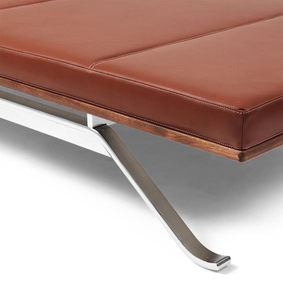 Briksen består af en lang lærreds- eller læderhynde, der hviler på en træramme med et slankt stel i rustfrit stål. Håndværk og kvalitet er i højsædet og her er tale om gedigen moderne dansk design med referencer til den klassiske danske designtradition. Der kan tilkøbes en matchende hynde.
