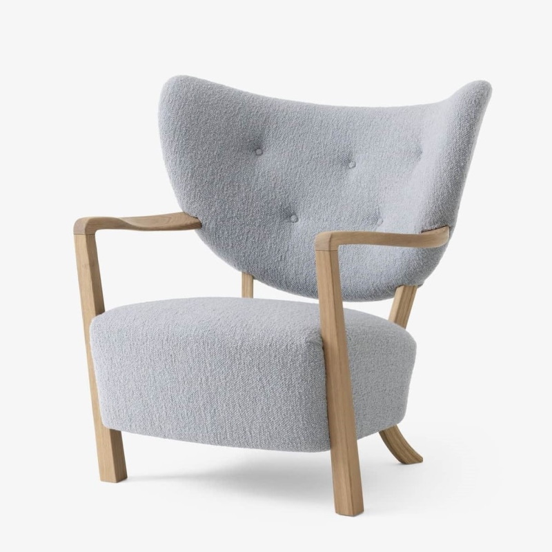 De massive træben fås i olieret eg eller valnød og med polstring i bl.a. fåreskind eller udvalg af andre tekstiler og farver.